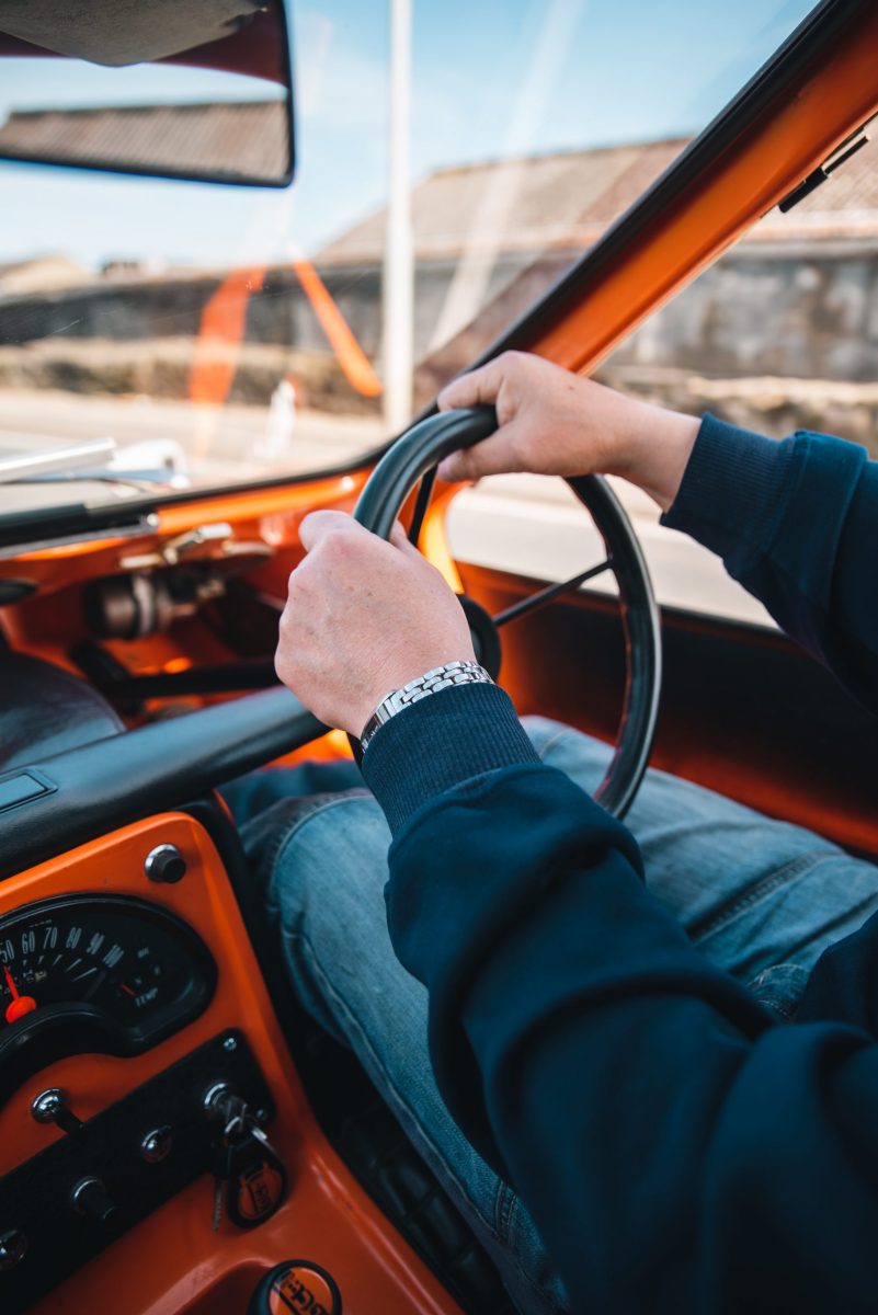 Getting in to the Bug requires some initial thought. The technique is to lift the roof, plonk your bum in to the seat (sidesaddle) and then swing your legs in. Once in, lower the roof and remember to mind your head! With the roof safely closed, fire up the engine, and away you go.